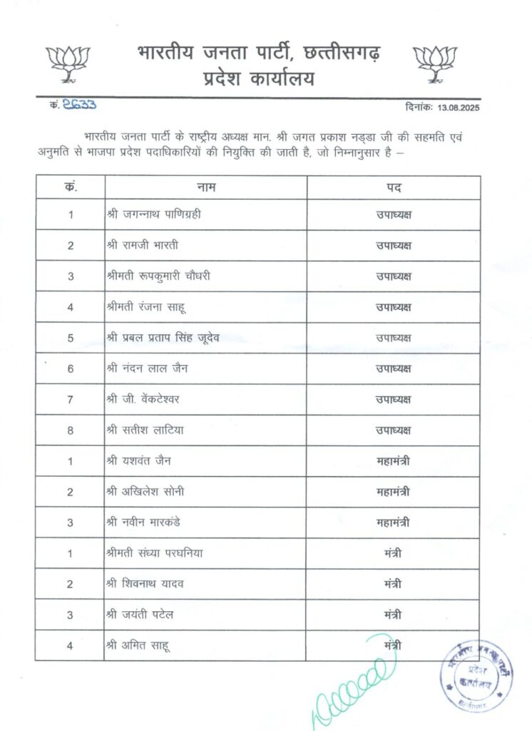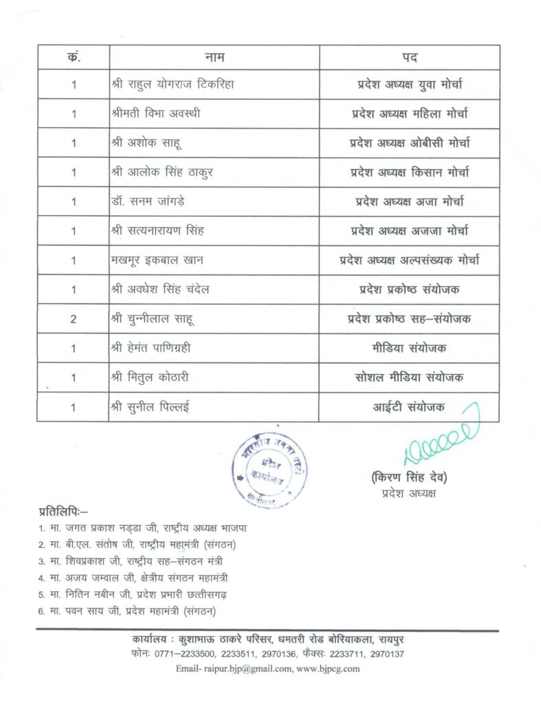 भारतीय जनता पार्टी ने छत्तीसगढ़ में प्रदेश पदाधिकारीयों की नई टीम की गठित, देखें लिस्ट