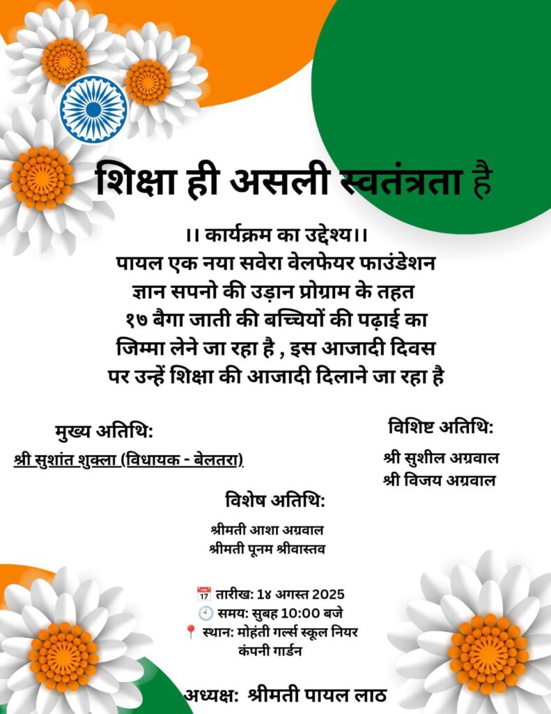 बिलासपुर, छत्तीसगढ़: इस स्वतंत्रता दिवस पर, जब पूरा देश आजादी का जश्न मना रहा होगा, बिलासपुर में पायल एक नया सवेरा वेलफेयर फाउंडेशन एक अनूठी पहल के साथ शिक्षा की अलख जगाने जा रहा है। फाउंडेशन के ‘ज्ञान सपनों की उड़ान’ कार्यक्रम के तहत, 17 बैगा जनजाति की बच्चियों की शिक्षा का पूरा खर्च उठाया जाएगा, जिससे उन्हें सही मायने में शिक्षा की आज़ादी मिल सके।