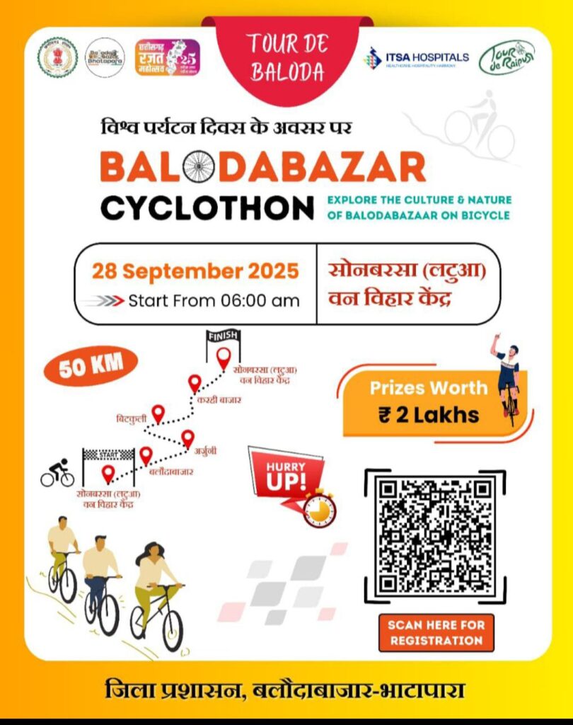 बलौदाबाजार: फ्रांस के विश्व-प्रसिद्ध ‘टूर दे फ्रांस’ की शानदार परंपरा को छत्तीसगढ़ में आगे बढ़ाते हुए, बलौदाबाजार में ‘टूर दे बलौदाबाजार साइक्लोथॉन’ का भव्य आयोजन हुआ। विश्व पर्यटन दिवस और छत्तीसगढ़ रजत जयंती महोत्सव के अवसर पर, यह साइक्लोथॉन न केवल एक खेल आयोजन था, बल्कि पर्यटन, स्वास्थ्य और सरकारी नेतृत्व के बीच समन्वय का एक प्रेरणादायक उदाहरण बन गया।