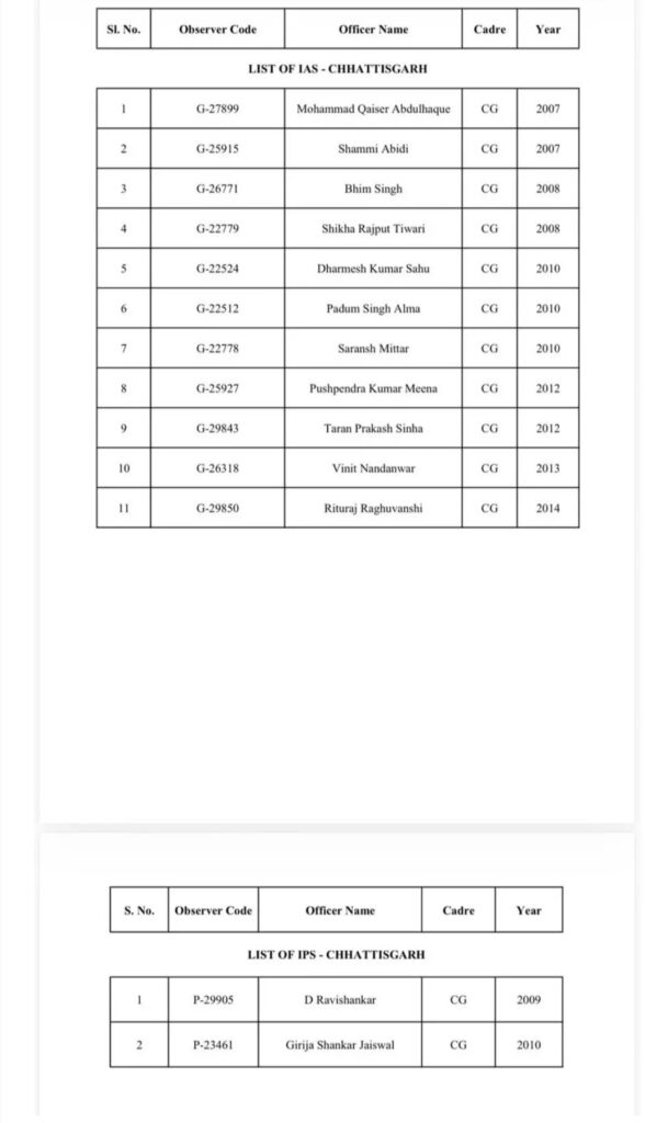 इन अधिकारीयों की सूची भी दिलचस्प है:आईएएस अफसरों में अब्दुल कैसर हक़, शम्मी आबिदी, भीम सिंह, शिखा राजपूत तिवारी, धर्मेश साहू, पीएस एल्मा, सारांश मित्तल, पुष्पेंद्र मीणा, तारण प्रकाश सिन्हा, विनीत नंदनवार और रितुराज रघुवंशी शामिल हैं।आईपीएस अधिकारी: डी. रविशंकर और गिरजा शंकर जायसवाल।चुनाव आयोग की सख्त हिदायतेंसभी पर्यवेक्षकों को 3 अक्टूबर को दिल्ली में इंडिया इंटरनेशनल इंस्टीट्यूट ऑफ डेमोक्रेसी एंड इलेक्शन मैनेजमेंट सेंटर में ब्रीफिंग के लिए बुलाया गया है। आयोग ने साफ कर दिया है कि कोई भी अधिकारी अनधिकृत अनुपस्थिति दिखाता है तो अनुशासनात्मक कार्रवाई होगी। केवल 24 घंटे के अंदर अपनी स्वीकृति व रिपोर्ट भेजना अनिवार्य है।छत्तीसगढ़ की छवि राष्ट्रीय मंच परयह नियुक्ति दर्शाती है कि छत्तीसगढ़ के अधिकारी न सिर्फ राज्य, बल्कि देश की लोकतांत्रिक प्रक्रिया में भरोसेमंद और कुशल भूमिका निभा रहे हैं।