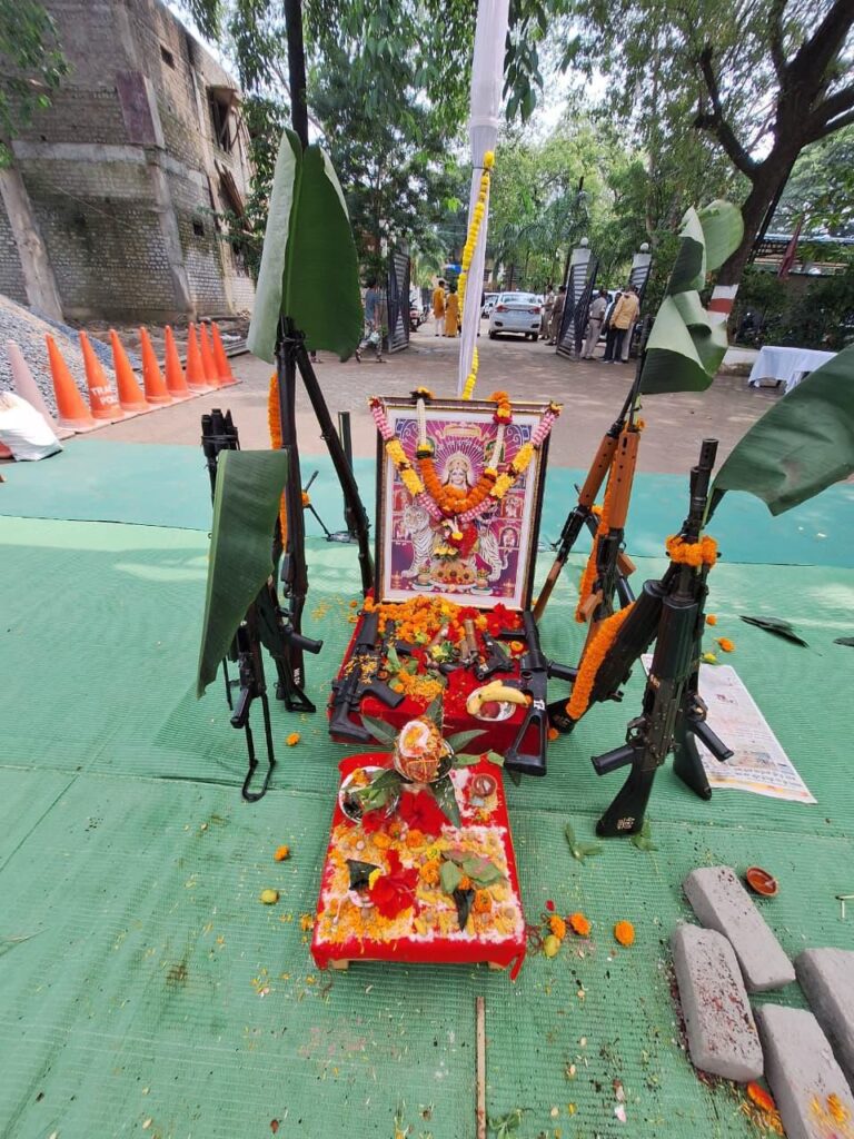 पुलिस विभाग द्वारा शस्त्र पूजा में वरिष्ठ पुलिस अधीक्षक श्री रजनेश सिंह आईपीए के साथ अतिरिक्त पुलिस अधीक्षक शहर राजेंद्र जयसवाल, अतिरिक्त पुलिस अधीक्षक ग्रामीण अर्चना झा, अतिरिक्त पुलिस अधीक्षक accu अनुज कुमार, अतिरिक्त पुलिस अधीक्षक यातायात रामगोपाल करियारे, अतिरिक्त पुलिस अधीक्षक iucaw गरिमा द्वैविदी, डीएसपी hq रश्मित कौर चावला, सीएसपी कोतवाली आईपीएस गगन कुमार, सीएसपी सिविल लाइन निमितेश सिंह, डीएसपी यातायात शिव चरण सिंह परिहार, डीएसपी लाल चंद मोहले, डीएसपी अनिता मिंज, डीएसपी भारती मरकाम, रक्षित निरीक्षक भूपेन्द्र गुप्ता और थाना चौकी प्रभारी तथा पुलिस के साथ होम गार्ड, सशस्त्र बल के अधिकारी कर्मचारी मौजूद रहे सभी थाना चौकी में भी सभी अधिकारी कर्मचारी द्वारा माँ दुर्गा की पूजा किए।