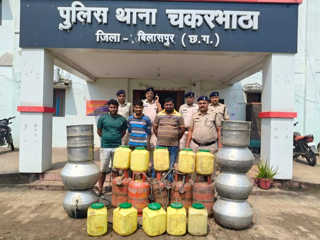 बिलासपुर (छ.ग.): नशे के अवैध कारोबारियों पर बिलासपुर पुलिस ने एक बार फिर करारा ‘प्रहार’ किया है। वरिष्ठ पुलिस अधीक्षक श्री रजनेश सिंह (भा.पु.से.) के सख्त निर्देश पर जिले में अवैध शराब के खिलाफ लगातार चल रही कार्रवाई के तहत, थाना चकरभाठा पुलिस ने बड़ी सफलता हासिल की है। अवैध रूप से महुआ शराब का विनिर्माण कर धन अर्जित करने वाले तीन आरोपियों को रंगे हाथों गिरफ्तार किया गया है और उनके पास से भारी मात्रा में शराब और उपकरण जब्त किए गए हैं।