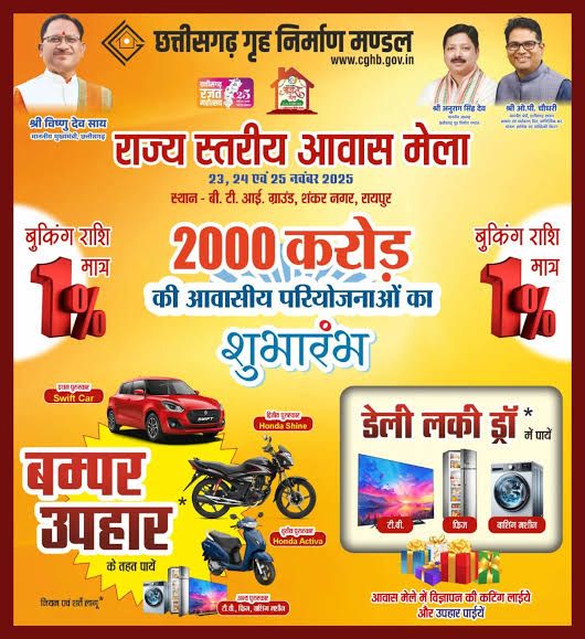 рдЫрддреНрддреАрд╕рдЧрдврд╝ рд░рд╛рдЬреНрдп рдХреА рд╕реНрдерд╛рдкрдирд╛ рдХреЗ рд░рдЬрдд рдЬрдпрдВрддреА рд╡рд░реНрд╖ рдХреЛ рдЪрд┐рд╣реНрдирд┐рдд рдХрд░рддреЗ рд╣реБрдП, рдореБрдЦреНрдпрдордВрддреНрд░реА рд╢реНрд░реА рд╡рд┐рд╖реНрдгреБ рджреЗрд╡ рд╕рд╛рдп рдХреЗ рдорд╛рд░реНрдЧрджрд░реНрд╢рди рдореЗрдВ рдЖрдЬ рд░рд╛рдЬрдзрд╛рдиреА рд░рд╛рдпрдкреБрд░ рдореЗрдВ ‘рд░рд╛рдЬреНрдп рд╕реНрддрд░реАрдп рдЖрд╡рд╛рд╕ рдореЗрд▓рд╛’ рдХрд╛ рднрд╡реНрдп рд╢реБрднрд╛рд░рдВрдн рд╣реЛ рдЧрдпрд╛ рд╣реИред рдЫрддреНрддреАрд╕рдЧрдврд╝ рдЧреГрд╣ рдирд┐рд░реНрдорд╛рдг рдордВрдбрд▓ (CGHB) рджреНрд╡рд╛рд░рд╛ рдЖрдпреЛрдЬрд┐рдд рдпрд╣ рддреАрди рджрд┐рд╡рд╕реАрдп (23 рд╕реЗ 25 рдирд╡рдВрдмрд░ 2025) рдореЗрд▓рд╛ рдкреНрд░рджреЗрд╢рд╡рд╛рд╕рд┐рдпреЛрдВ рдХреЗ рд▓рд┐рдП рдХрд┐рдлрд╛рдпрддреА рдЖрд╡рд╛рд╕ рдХреЗ рд╕рдкрдиреЗ рдХреЛ рд╕рд╛рдХрд╛рд░ рдХрд░рдиреЗ рдХреА рджрд┐рд╢рд╛ рдореЗрдВ рдПрдХ рдРрддрд┐рд╣рд╛рд╕рд┐рдХ рдХрджрдо рд╣реИредтЬи тВ╣2000 рдХрд░реЛрдбрд╝ рдХреА рдпреЛрдЬрдирд╛рдУрдВ рдФрд░ рдирд╡реАрди рдкреЛрд░реНрдЯрд▓ рдХрд╛ рд╢реБрднрд╛рд░рдВрдн:-рдЗрд╕ рдЕрд╡рд╕рд░ рдкрд░, рд╣рд╛рдЙрд╕рд┐рдВрдЧ рдмреЛрд░реНрдб рдиреЗ рдкреНрд░рджреЗрд╢ рдХреЗ рд╡рд┐рднрд┐рдиреНрди рдЬрд┐рд▓реЛрдВ рдХреЗ рд▓рд┐рдП рд▓рдЧрднрдЧ тВ╣2000 рдХрд░реЛрдбрд╝ рд░реБрдкрдП рдХреА рдирдИ рдЖрд╡рд╛рд╕реАрдп рдФрд░ рд╡реНрдпрд╛рд╡рд╕рд╛рдпрд┐рдХ рдпреЛрдЬрдирд╛рдУрдВ рдХрд╛ рд╢реБрднрд╛рд░рдВрдн рдХрд┐рдпрд╛ рд╣реИред рдЗрди рдпреЛрдЬрдирд╛рдУрдВ рдХреА рд╕рдмрд╕реЗ рдЦрд╛рд╕ рдмрд╛рдд рдпрд╣ рд╣реИ рдХрд┐ рд▓рдЧрднрдЧ 70 рдкреНрд░рддрд┐рд╢рдд рдЖрд╡рд╛рд╕реАрдп рд╕рдВрдкрддреНрддрд┐рдпрд╛рдБ рд╕рдорд╛рдЬ рдХреЗ рдХрдордЬреЛрд░ рдЖрдп рд╡рд░реНрдЧ (EWS) рдХреЗ рд▓рд┐рдП рдЖрд░рдХреНрд╖рд┐рдд рдХреА рдЧрдИ рд╣реИрдВ, рдЬреЛ ‘рд╕рдмрдХреЗ рд▓рд┐рдП рдЖрд╡рд╛рд╕’ рдХреЗ рд╕рдВрдХрд▓реНрдк рдХреЛ рдордЬрдмреВрдд рдХрд░рддреА рд╣реИрдВред