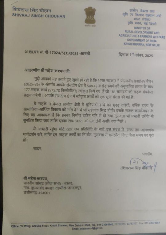 विकास और कनेक्टिविटी का नया अध्याययह स्वीकृति बस्तर क्षेत्र के समग्र विकास की दिशा में एक निर्णायक कदम है। केंद्रीय मंत्री शिवराज सिंह चौहान ने सांसद महेश कश्यप को प्रेषित पत्र में यह विश्वास दिलाया है कि ये सड़कें न केवल ग्रामीण क्षेत्रों में बुनियादी ढाँचे को सुदृढ़ करेंगी, बल्कि यह सामाजिक-आर्थिक विकास को भी बढ़ावा देंगी। इसके सफल कार्यान्वयन से सुनिश्चित होगा कि इन निर्माण कार्यों का लाभ क्षेत्र के लोगों को लंबी अवधि तक मिलता रहे। सांसद महेश कश्यप ने इस अवसर पर कहा, मैं प्रधानमन्त्री नरेंद्र मोदी एवं केंद्र मंत्री शिवराज सिंह चौहान का हृदय से आभारी हूँ। यह स्वीकृति मेरे लोकसभा क्षेत्र के सर्वोत्तम विकास की गति को बनाए रखने में सहायक सिद्ध होगी। इन सड़कों से न सिर्फ सुदूर अंचल तक आवागमन सुगम होगा, बल्कि शिक्षा, स्वास्थ्य और कृषि उत्पादों को बाजार तक पहुँचाने में भी आसानी होगी। मैं बस्तर की जनता को विश्वास दिलाता हूँ कि पीएमजीएसवाई के आगामी समय में भी बस्तर को प्राथमिकता के साथ स्वीकृति मिलती रहेगी।.