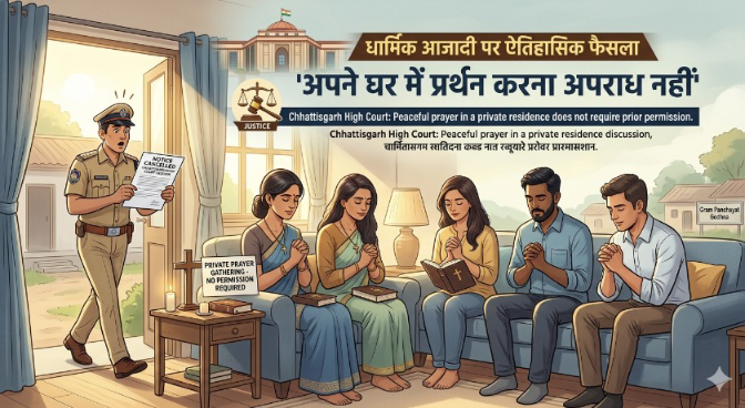 छत्तीसगढ़ हाईकोर्ट ने व्यक्तिगत स्वतंत्रता और धार्मिक अधिकारों को लेकर एक बेहद अहम और दूरगामी फैसला सुनाया है। कोर्ट ने स्पष्ट कर दिया है कि किसी भी व्यक्ति को अपने निजी आवास में शांतिपूर्ण ढंग से प्रार्थना सभा आयोजित करने का पूर्ण अधिकार है और इसके लिए प्रशासन या पुलिस से किसी पूर्व अनुमति की आवश्यकता नहीं है।