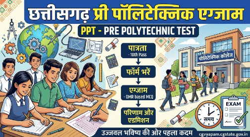 संचालनालय तकनीकी शिक्षा, छत्तीसगढ़ के सम्बन्धित पालीटेक्निक कालेजों में प्रवेश के लिए प्री-पॉलीटेक्निक प्रवेश परीक्षा (PPT) 2026 हेतु ऑनलाइन आवेदन एवं परीक्षा कार्यक्रम घोषित किया गया है। यह परीक्षा राज्य के विभिन्न पॉलीटेक्निक संस्थानों में प्रवेश हेतु आयोजित की जाएगी, जिसमें इच्छुक अभ्यर्थी निर्धारित तिथियों के अनुसार ऑनलाइन आवेदन कर सकते हैं।